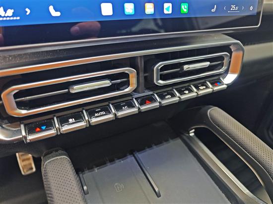 材质用料方面,车内大面都包裹了软质材料,而且顶棚还配备了更加显档次的绒面材质,让硬汉也有柔情的一面。同时,车内还保留了一些实体的快捷按键,像是空调温度、风量、驾驶模式等都能快速调整,在户外越野情况下,能快速盲操,有助提升驾驶安全性。