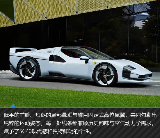 SC40是一款真正意义上独一无二的定制力作,由法拉利特别项目Special Projects部门为特定客户量身打造。新车名称“SC40”以立体浮雕形式镌刻于车身侧面,不仅象征其独特身份,也向品牌历史上最具代表性的超级跑车F40致敬。然而,SC40并非对经典的简单复刻,而是一次对法拉利设计哲学的现代化诠释。