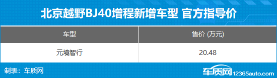 2025年11月13日,北京越野官方宣布,旗下BJ40增程元境智行正式上市,共推出1款车型,售价20.48万元,限时焕新价19.48万。新车重点针对配置进行升级,搭载高阶辅助驾驶系统,提供高速领航功能,外观内饰设计和动力系统则与现款车型保持一致。