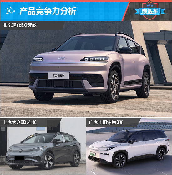 此次与2025款北京现代EO羿欧(下文简称EO羿欧)对比的车型分别为2025款改款上汽大众ID.4 X(下文简称大众ID.4 X)和2025款广汽丰田铂智3X(下文简称铂智3X)。三款车型中,EO羿欧在车身长度、宽度和高度方面占优,而大众ID.4 X和铂智3X两者轴距相同,比EO羿欧略长一些。