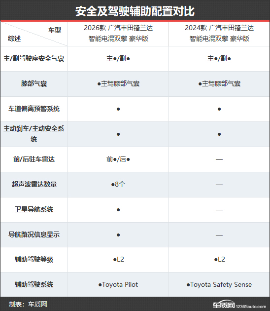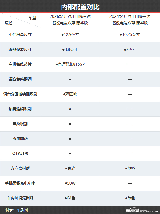 可以看到,相比老款车型,2026款广汽丰田锋兰达不仅对外观设计进行了更为年轻化的调整,还在车内智能配置、辅助驾驶功能上下足功夫,此外,在动力参数提升的同时,燃油经济性也得到了优化,完全能看作一次全维焕新。以上文对比车型为例,在售价不变的前提下,能有如此多的升级,可谓诚意满满。伴随着2026款广汽丰田锋兰达产品竞争力的进一步提升,未来有望取得更好的市场成绩。