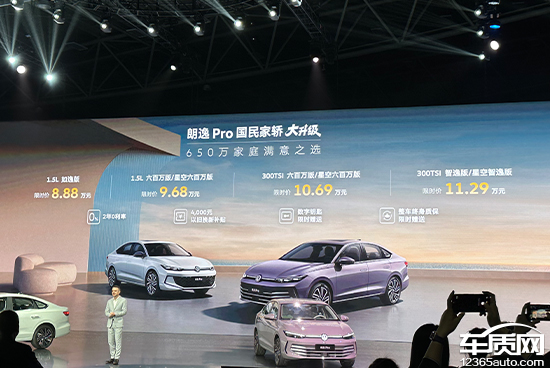 11月17日,上汽大众朗逸Pro在上海正式上市,新车共推出4款车型,官方指导价区间为12.09-14.59万元,限时价为8.88-11.29万元。除1.5L如逸版外,其余车型均提供两种前脸造型可选,价格均保持一致。同时,官方还推出2年0利率、4000元以旧换新补贴、整车终身质保等上市权益。