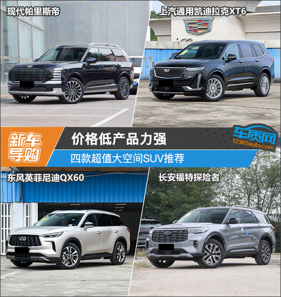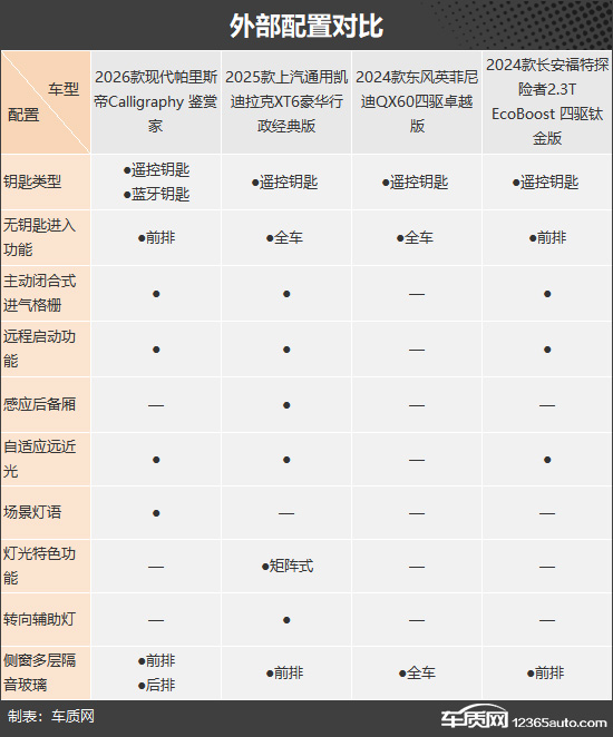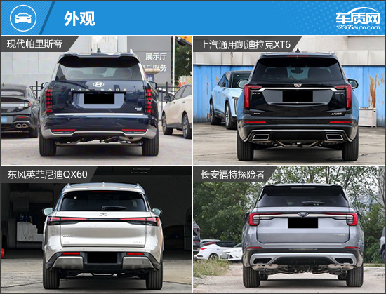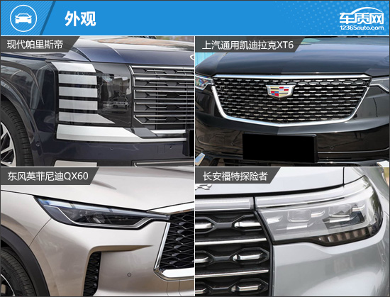 本次挑选的四款车型分别为2026款现代帕里斯帝Calligraphy 鉴赏家(以下称:现代帕里斯帝)、2025款上汽通用凯迪拉克XT6豪华行政经典版(以下称:凯迪拉克XT6)、2024款东风英菲尼迪QX60四驱卓越版(以下称:英菲尼迪QX60)和2024款长安福特探险者2.3T EcoBoost 四驱钛金版(以下称:福特探险者)。四款车型产品特点和市场定位基本相同,且终端售价也比较接近(由于目前图片数量较少,因此部分车型的图片并不是相对应的具体款型)。