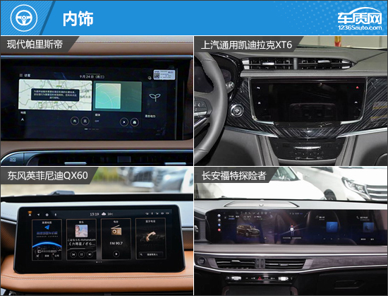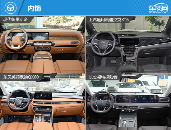 内饰方面,四款车型在整体风格上有很大差异。现代帕里斯帝基于“Premium Living Space”理念打造,不仅更具设计感,沙发式中央控制台与手枕兼顾了舒适性与支撑性。凯迪拉克XT6是传统美系豪华车设计风格,中控屏幕采用内嵌式设计,更强调整体感。英菲尼迪QX60主打简约路线,采用小尺寸悬浮式中控屏幕和平底式三辐方向盘,优雅中不失运动。福特探险者非常注重科技感的营造,配备12.3英寸全液晶仪表盘和27英寸4K中控屏的组合,科技感直接拉满。换挡形式方面,凯迪拉克XT6和英菲尼迪QX60采用电子挡把换挡,样式略显传统,现代帕里斯帝和福特探险者采用更具精致感的旋转式电子怀挡和电子式旋钮换挡。