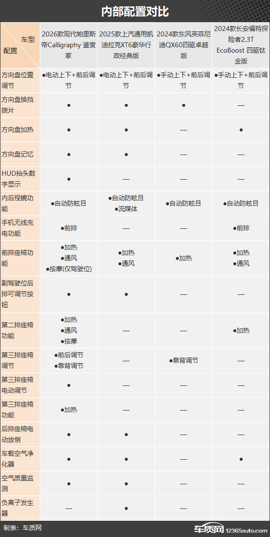 内部配置方面,现代帕里斯帝表现可圈可点,特别是在舒适性和实用性配置方面优势明显。如独享了第三排座椅电动调节、第三排座椅加热功能、HUD抬头数字显示、第二排座椅通风和按摩功能等,能够带来更好的用车体验。相比之下,英菲尼迪QX60内部配置表现稍显逊色,是四款车型中唯一未配备方向盘加热的车型。