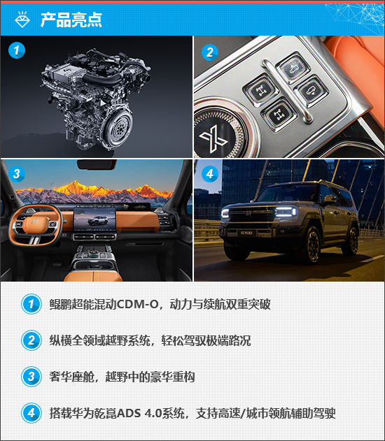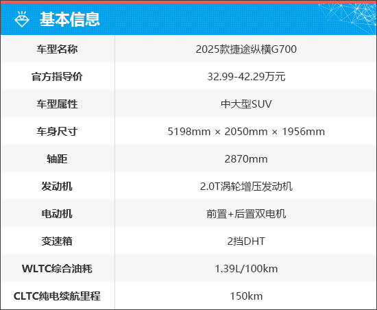 捷途纵横G700定位硬派越野SUV,此次共推出7款车型,包含了5座和6座两种座椅布局,官方指导价32.99-42.29万元。动力上,全系搭载鲲鹏超能混动CDM-O系统,CLTC纯电续航里程150km。