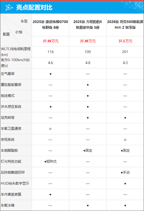 具体到车辆配置层面,通过对比来看,三款车型实力旗鼓相当,只不过配置侧重点有所不同。其中,捷途纵横G700独享空气悬架、矩阵式灯光特色功能、车内香氛装置,并且还提供了车载卫星通信的选装;方程豹豹8则独享魔毯智能悬架和拖挂模式;坦克500新能源不仅WLTC纯电续航里程最长,官方百公里加速最快,而且配置上还独享手动后排侧窗遮阳帘、HUD抬头数字显示,并且还提供夜视系统的选装。