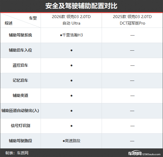 安全及驾驶辅助方面,新款领克03搭载高算力辅助驾驶芯片——地平线征程J6M,提供千里浩瀚辅助驾驶H3方案,可实现NOA高速领航驾驶辅助与全场景泊车。相比之下,老款车型配备基础版的L2级辅助驾驶,仅能实现全速自适应巡航跟车、车道保持辅助、车道居中保持等功能。