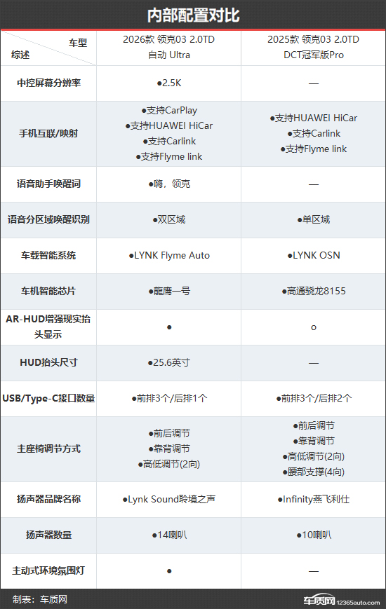 内部配置方面,除了上述提到的部分功能,新款领克03还将老款车型上可选装的AR-HUD增强现实抬头显示升级为标配,尺寸达到25.6英寸。此外,2.0T车型升级为14扬声器音响系统,并提供主动式环境氛围灯,豪华感得到大幅提升。不过,新款领克03也相应减少了部分配置,例如取消了老款车型上的主驾驶座椅腰部支撑调节,并且将Infinity燕飞利仕音响更换为Lynk Sound聆境之声。