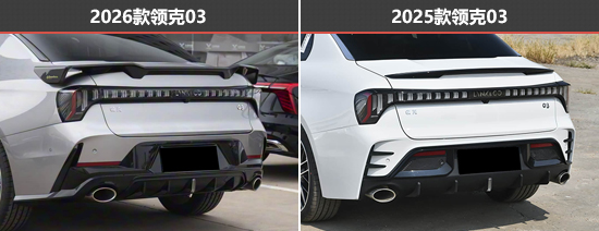 新款领克03采用全新锋刃尾部造型设计,最直观的变化在于后包围更加简洁,后扰流板尺寸有所增大且角度进行细微调整,进一步优化空气动力学表现。除了上述变化外,新款领克03在车漆方面还新增了“极光银”配色可选。