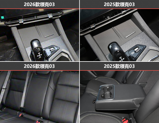 由于新老款领克03在宽度、高度和轴距方面均保持一致,并且座椅造型也基本没有变化,因此乘坐空间方面表现差异不大。储物空间方面,新款领克03也并未对车内前排布局进行改动,电子挡把前方配备双手机槽,右侧支持50W手机无线充电功能。中控台下方提供开放式储物格,方便放置较大尺寸的物品。至于后排,新款领克03取消了老款车型的后排中央扶手和杯架,考虑到其运动型车的定位,后排使用频率不高,这样的调整也在情理之中。
