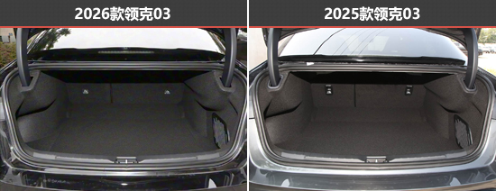 新老款领克03的后备厢开口造型较为规整,内部容积也保持一致。后排座椅均支持比例放倒,可进一步扩展后备厢空间。