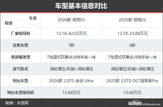 新款领克03系列包含7款车型,其中领克03共推出4款车型,售价区间12.18-15.68万元。领克03+共推出3款车型,售价区间23.88-42.03万元。此次改款最重要的变化在于,新款领克03将以往仅用于高性能车型的2.0T动力总成进行了下放,并提升了发动机参数。因此,本文将选取新老款领克03普通版本中的2.0T车型进行对比,以便能够更加直观地看出配置层面的具体差异。