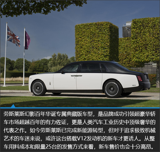 劳斯莱斯幻影百年华诞专属典藏版车型不仅拥有霸气庄重的外观设计,内部装饰也足见设计师和工程师的用心,让大家领略到了顶级奢华该有的样子。如今,它的价值已经不仅仅是一台超豪华汽车本身,更像是人类造车工艺登峰造极的载体。能够成功历经百年洗礼,穿越一个世纪,不得不说劳斯莱斯幻影已然成为了品牌名副其实的百年招牌产品。