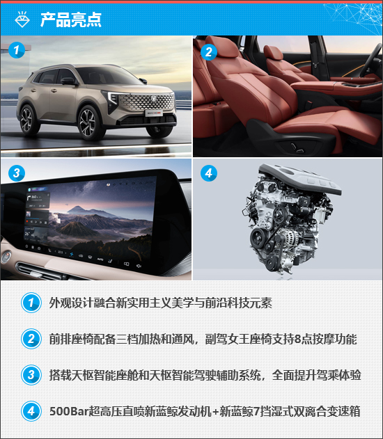 动力部分搭载500Bar超高压直喷新蓝鲸1.5T发动机,最大功率为141kW,峰值扭矩为310N·m。传动系统匹配蓝鲸新一代7挡湿式双离合变速箱,并配备iEM智慧能量管理系统,可智能识别堵车、过弯、爬坡、制动再加速工况,提升燃油经济性。CMV阀系减震器通过精细化调整悬架参数,在保证稳定操控的同时也兼顾了舒适的驾乘体验。