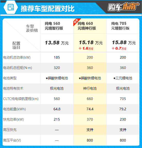 在纯电车型中,我们更推荐纯电660元境神行版。与增程版不同,纯电版车型之间的主要差异集中在性能层面。相比纯电560元境智行版,推荐车型基于800V高压平台打造,在动力性能、续航能力及快充功率方面均有显著提升,使出行半径更广,补能效率进一步优化。至于顶配车型,其优势在于配备了三元锂电池,具备更高的冬季续航达成率,但考虑到与推荐车型仅有45km的续航差距,且快充功率存在明显劣势,结合0.7万元的差价来看,整体吸引力有限。