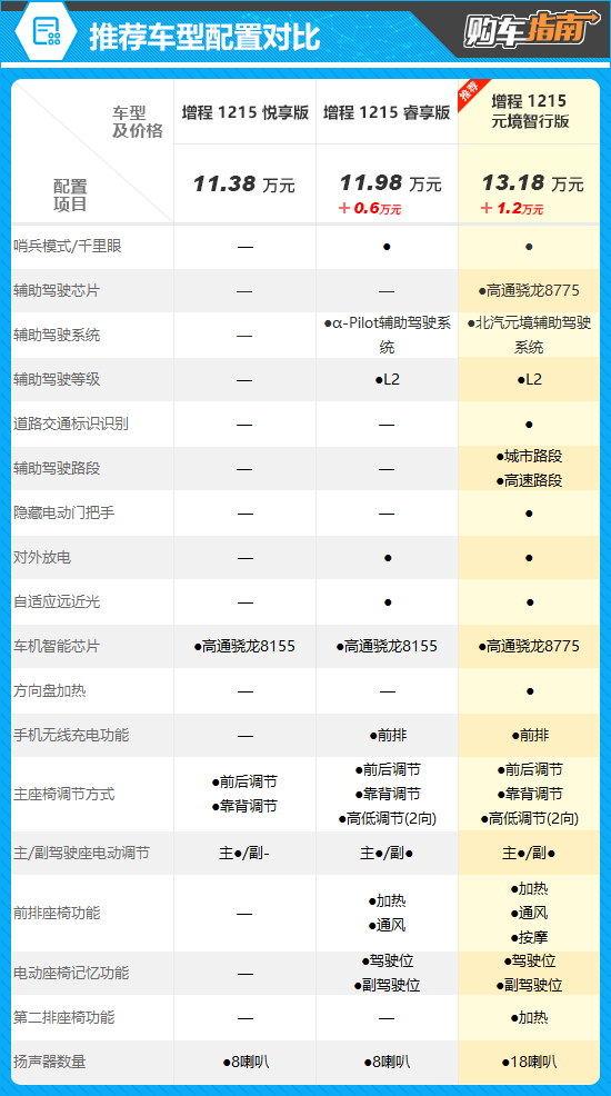 在增程版车型中,增程1215元境智行版是最值得推荐的选择。增程1215睿享版相比前文提到的入门车型仅高出0.6万元,在安全配置、辅助驾驶和舒适配置方面均有明显升级,整体配置更具吸引力。但与推荐车型相比,其未配备新款车型最大的升级点——北汽元境辅助驾驶系统,在功能完善度上明显不足。此外,推荐车型还提供隐藏式电动门把手、方向盘加热、第二排座椅加热等配置功能,扬声器数量也更多,能够带来更高品质的驾乘体验。综合1.2万元的价差来看,推荐车型的提升幅度非常具有吸引力。
