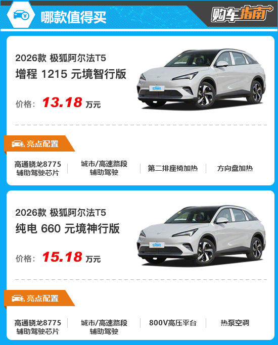 因此,综上所述,增程1215元境智行版和纯电660元境神行版在极狐全新阿尔法T5全系车型中拥有着更高的性价比,消费者在购车时可以优先考虑。
