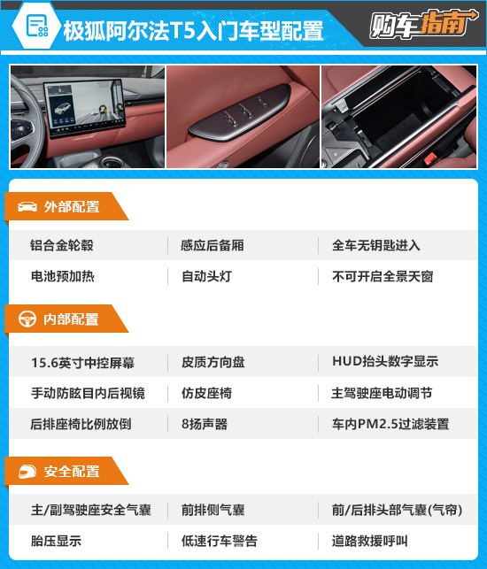极狐全新阿尔法T5入门车型为增程1215悦享版,售价11.38万元。其配置表现能够满足基础的家庭用车需求,配备感应后备厢、不可开启全景天窗、HUD抬头数字显示、低速行车警告等功能,在舒适性、便利性及安全性方面均有所覆盖,但整体配置水平较为初级。考虑到该车型在部分细节配置上仍有欠缺,用车体验与高配车型差距较为明显,因此并非全系中性价比最高的选择。