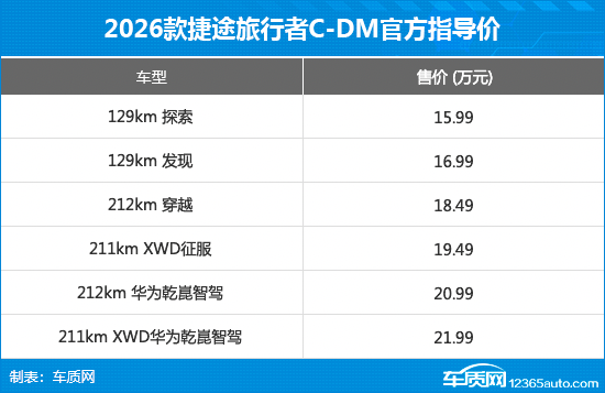 11月17日,2026款捷途旅行者C-DM正式上市,此次共推出6款车型,售价15.99-21.99万元,限时焕新价15.29-20.99万元。值得一提的是,官方表示山海T2现正式更名为“捷途旅行者C-DM”,与燃油版形成完整产品矩阵。
