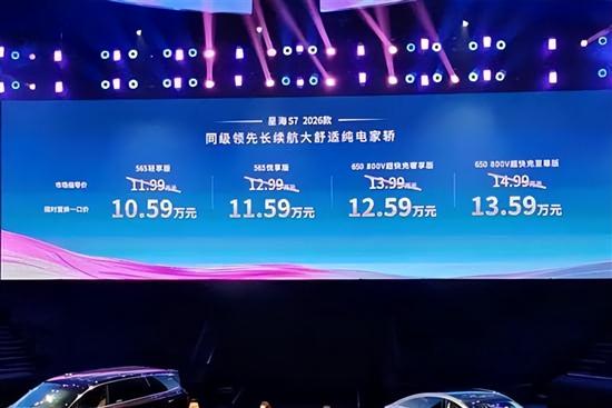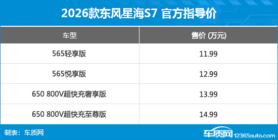 11月19日,2026款东风星海S7正式上市,新车共推出4款车型,官方指导价区间为11.99-14.99万元,限时置换一口价为10.59-13.59万元。同时,官方还推出限时升舱礼、限时交车礼等至高45000元购车权益。