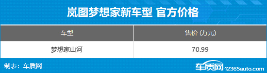 11月21日,岚图梦想家山河正式上市,售价70.99万元。同步推出山河专属四重礼,包含皓月紫云/拂晓金辉尊属双色车身、20英寸高定星漩轮毂(带岚图悬浮徽标),及殿堂级丹拿品质音响;华为乾崑智驾ADS 4高阶功能包现金抵扣;超级置换补贴;专属定制VIN码权益;三电系统终身质保、车机流量终身免费、道路救援终身免费等权益。