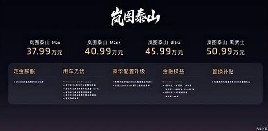 11月18日,岚图汽车全新豪华大六座SUV——岚图泰山正式上市,新车共提供4款配置,官方售价区间为37.99-50.99万元。其中,黑武士版将作为限量车型,于明年一季度开启交付。
