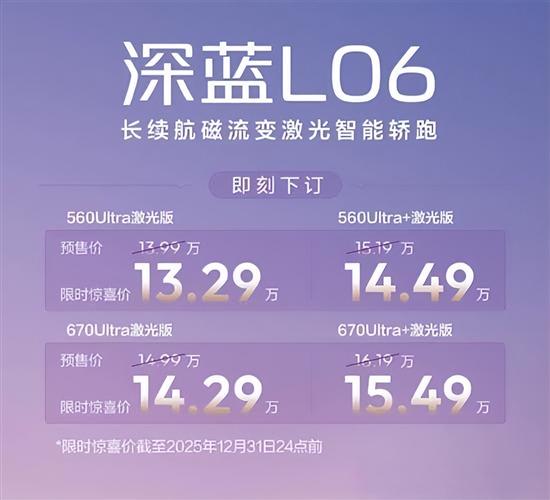 2025年11月18日,深蓝汽车官方宣布旗下全新中型车——深蓝L06正式上市,共推出4款车型,售价区间13.49-15.69万元,限时惊喜价13.29-15.49万元。官方表示,车主在2025年11月30日前锁单,非客户原因导致的跨年交付购置税差额由深蓝汽车承担。此外,购车用户可享至高价值78,760元的正式权益,包括智趣置换礼、智趣金融礼、智趣领航礼、智趣尊享礼等。
