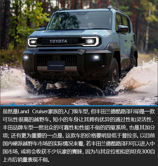 一辆来自丰田、价格亲民且尺寸适中的硬派越野车——这正是丰田兰德酷路泽FJ的核心卖点,它的出现也拉近了普通消费者和Land Cruiser家族的距离。考虑到国内消费者的需求特点,哪怕是丰田不以官方进口的形式将其引入,平行进口车商也会将这款小车带到中国市场,其有实力成为越野车市场的新宠。