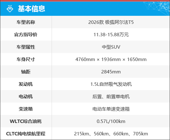 2026款极狐阿尔法T5共推出7款车型,包含增程式和纯电动两种动力版本,官方指导价为11.38-15.88万元。此外,官方还推出了限时优惠价,价格仅为10.98万元起,并提供5年或12万公里整车质保(含增程器)、3年不限量免费流量等8大尊享礼遇(详情请咨询当地经销商)。