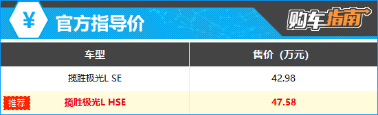 2026款路虎揽胜极光L共推出2款车型,官方价格为42.98-47.58万元,限时折扣后厂家建议零售价仅为23.98万元起,优惠力度很大(详情请咨询当地经销商)。