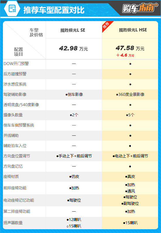 在全系车型中,我们重点推荐的是指导价为47.58万元的揽胜极光L HSE。通过配置对比可以看出,推荐车型相比入门车型,增加了前排座椅通风、第二排座椅加热等舒适配置。并且座椅升级为真皮材质,方向盘更换为电动上下+前后调节且带有方向盘记忆功能。辅助驾驶方面,推荐车型具备倒车车侧预警系统、并线辅助、辅助泊车入位功能,智能体验大幅提升。越野配置上,推荐车型还有非常实用的涉水感应系统和透明底盘/540度影像,而价格只比入门车型多了4.6万元,可谓物有所值。