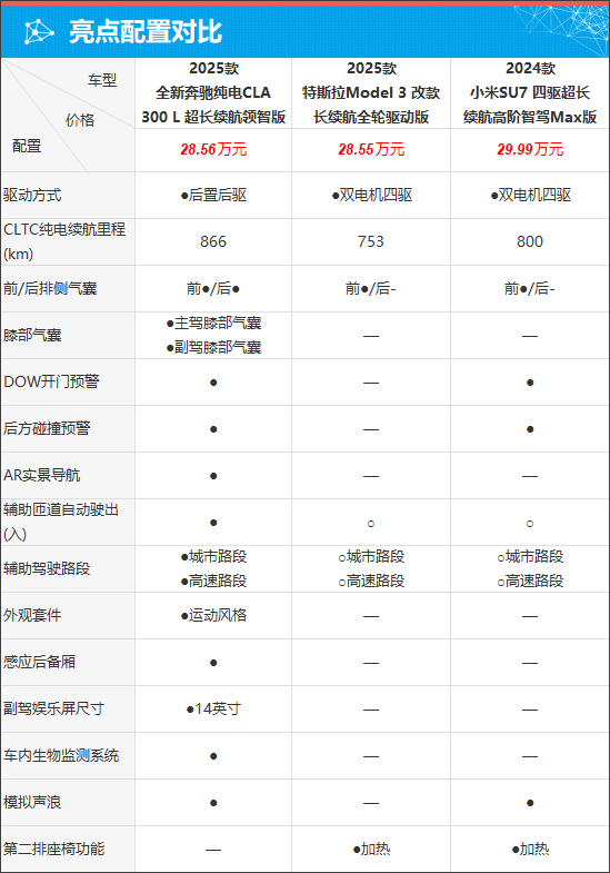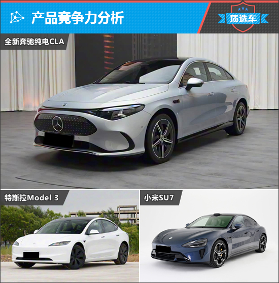 由于目前市面上25-30万元价格区间的纯电紧凑型车数量较少,因此本次选择对比的是同价位区间中主打年轻、科技的纯电车型,分别是特斯拉Model 3以及小米SU7,均是当下热度颇高的车型,看看全新奔驰纯电CLA如何应对。