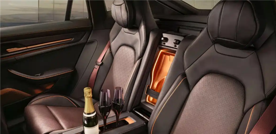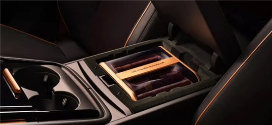 内饰是定制版的核心亮点,安全带与缝线采用日落红和巴瑞克红撞色设计,搭配黑色皮质面料与金属装饰,营造出典雅又不失动感的座舱氛围。中控台上的“Sonderwunsch”字样,明确彰显其专属定制身份。更贴合车主需求的是,中控台储物格内嵌入雪松木内衬的雪茄保湿盒,搭配湿度计与带照明功能的香槟柜,尽显奢华格调。此外,行李厢也全面铺设皮革,细节处拉满精致感。