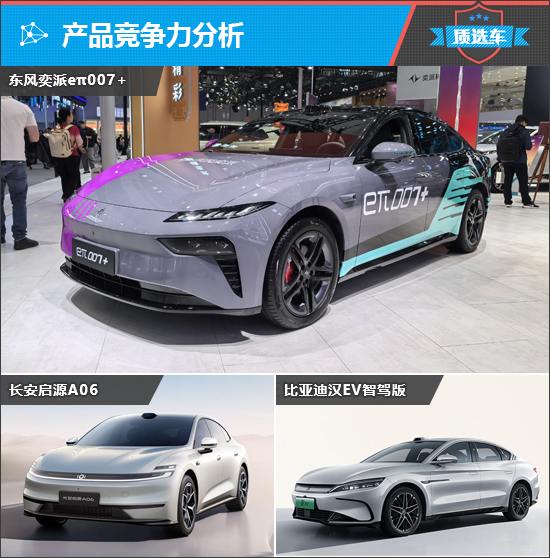本次我们均以纯电动车型为例进行对比,竞品分别选择了市场中关注度颇高的新产品2026款长安启源A06和销量常居头排位置的2025款比亚迪汉EV智驾版。
