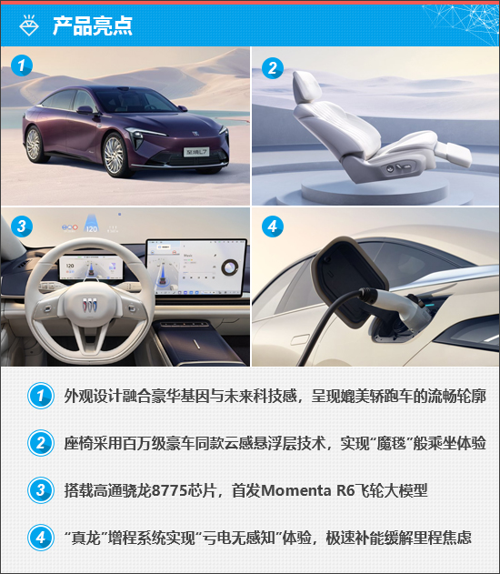 内饰以“纯净浮岛美学”为核心设计理念,环抱式座舱采用流线型曲面设计,搭配动态环绕氛围灯,模拟海浪般的流动光影效果,配合“水生美学”车机界面,营造出静谧而灵动的视觉体验。15.6英寸中控屏支持屏外环境渲染、地图显示和媒体播放三种内容的分屏显示,搭配高通骁龙8775芯片,支持全场景语音交互。“逍遥智行”辅助驾驶系统全球首发搭载基于端到端“强化学习”的Momenta R6飞轮大模型,可实现“无断点”城市NOA,不仅能像老司机一样流畅应对近距离加塞、机非混行、横穿马路“鬼探头”等高风险场景,而且还能精准识别潮汐车道流向、可变灯牌车道指示,自动匹配正确通行方向,为用户带来行业第一梯队的辅助驾驶体验。