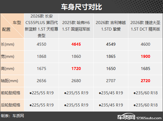 在车身尺寸方面,哈弗H6国潮版在车长和车高上领先,可带来充裕的头部空间;捷途大圣则拥有更好的车宽与轴距表现,后排满载时乘坐空间更为宽敞;长安CS55PLUS和吉利博越的尺寸虽无明显优势,但也能充分满足日常代步需求。
