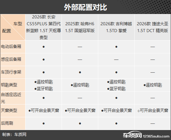 在外部配置方面,长安CS55PLUS与吉利博越的表现较为全面,前者更是唯一配备感应后备厢的车型;另两款车型外部配置缺失较多,捷途大圣不仅没有配备车顶行李架和后雨刷,可开启全景天窗也为选配,整体配置水平比较初级。