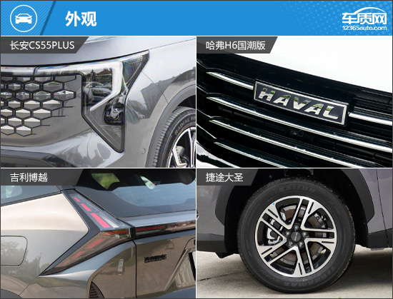 虽然四款车都以居家属性为主,但在外形设计上的差异却十分明显。长安CS55PLUS采用新实用主义风格,无边界前格栅配合名为“碑影锋芒”LED前大灯,可谓刚柔并济,辨识度极高。哈弗H6国潮版则沿用经典设计,当年凭借东方动势美学给人留下了深刻印象;吉利博越的新中式居家美学更显精致,将现代与古典元素完美融合;捷途大圣则是四车中最具个性的,富有棱角的线条展现出强烈的机甲风格,对年轻消费者无疑更具吸引力。