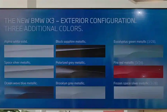 日前,车质网从相关渠道获得了全新宝马iX3的配置信息。新车将推出三款全新配色方案,包括火焰红、磨砂太空银、桉树绿,加上此前公布的六种车身颜色,共计九种。据悉,该车或将于2026年3月投产。