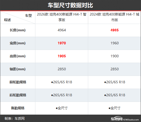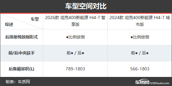 虽然新款车型在车身宽度和高度方面均有所增大,不过对于采用“方盒子”造型设计的坦克400新能源来说,细微变化并不足以对乘坐空间产生实质性影响,新老款车型整体表现也不会拉开明显差距。
