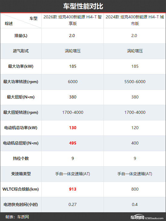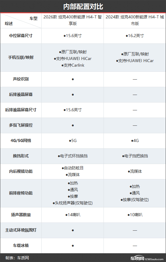 新款坦克400新能源共推出3款车型,包含2款Hi4-T版本和1款Hi4-Z版本,售价区间28.58-31.98万元。考虑到Hi4-T版本为坦克400的主销车型,因此本文将选取新老款坦克400新能源 Hi4-T的高配车型进行对比,从而更直观地展现出新老款车型配置层面的变化。