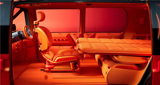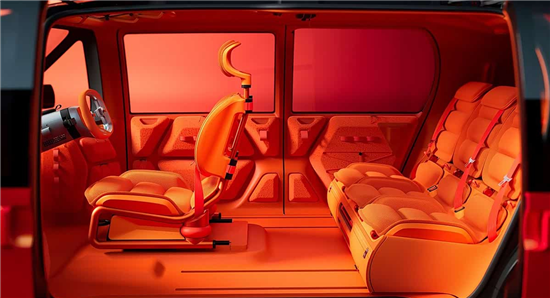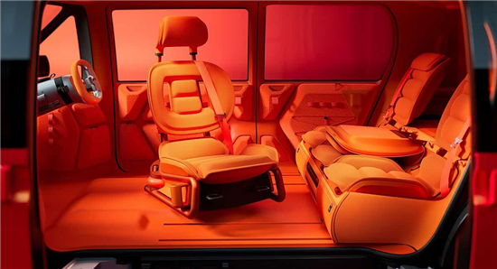 内饰部分,新车采用极简设计风格,取消了中控台设计,驾驶位布置在中央,形成1+3的四座布局或3+3的六座布局。另外,驾驶席还可旋转座椅,后排座椅则可以放倒并加装床垫,想象力十分丰富。