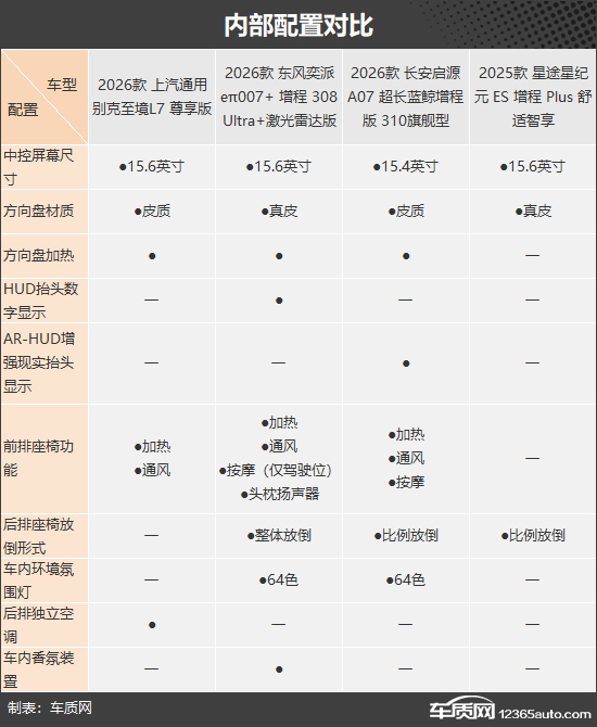 内部配置方面,除星途星纪元 ES外,其余三款车型均配备了方向盘加热、前排座椅加热/通风功能,舒适性表现不错。其中,上汽通用别克至境L7独享后排独立空调,对于后排乘客照顾到位;东风奕派eπ007+独享HUD抬头数字显示和车内香氛装置;长安启源A07则独享AR-HUD增强现实抬头显示。相比之下,星途星纪元 ES配置表现一般。
