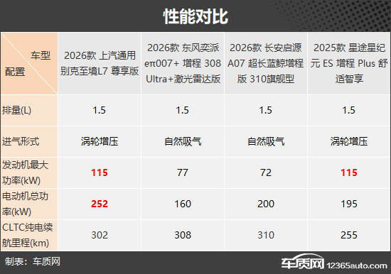 动力层面,四款车型均搭载发动机+单电机的增程动力架构,但核心硬件存在明显差异,上汽通用别克至境L7与星途星纪元 ES采用1.5T涡轮增压发动机,二者发动机最大功率均达115kW,动力储备更充沛;东风奕派eπ007+与长安启源A07则配备1.5L自然吸气发动机。其中,上汽通用别克至境L7的电动机总功率表现尤为亮眼,在动力输出层面具备突出优势。