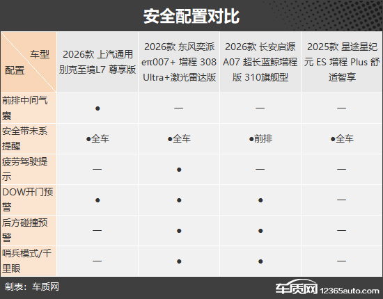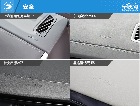 安全配置层面,四款车型各有侧重,其中东风奕派eπ007+与长安启源A07的表现更为全面,均配备后方碰撞预警和哨兵模式/千里眼功能,为日常行车提供全方位防护;东风奕派eπ007+在此基础上额外独享疲劳驾驶提示,对长途出行的安全性更有保障;上汽通用别克至境L7则以独有的前排中间气囊形成差异化优势,进一步提升车内乘员的碰撞防护水平;星途星纪元 ES的安全配置整体表现中规中矩。
