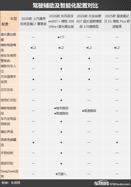 辅助驾驶层面,虽然四款车型均搭载L2级辅助驾驶,但在细分功能上差异明显。其中,东风奕派eπ007+表现最为出众,不仅硬件上提供1个激光雷达,而且还可实现记忆泊车、信号灯识别、城市路段辅助驾驶等功能,体验更为出色。相比之下,星途星纪元 ES表现一般,是唯一没有提供倒车车侧预警系统和方向盘离手检测的车型。