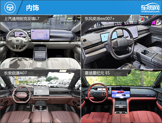 内饰方面,四款车型均秉持简洁设计理念,多数功能集成于中控屏,科技感拉满。其中,上汽通用别克至境L7整体风格豪华大气,尽显高端质感;东风奕派eπ007+布局干练利落,运动风格尤为突出;长安启源A07是四款中唯一未配备传统仪表盘的车型,设计颇具个性化;星途星纪元 ES则采用内嵌式仪表盘,与上汽通用别克至境L7、东风奕派eπ007+形成鲜明差异化设计。