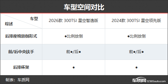 乘坐空间方面,由于新老款车型的轴距保持一致,因此腿部空间不会有显著变化,但在同级中依旧很有竞争力。储物空间方面,新款车型改为了旋转式电子怀挡,因此仪表台下方提供了两个手机槽。取消了机械换挡杆之后,拿放手机更为顺手。