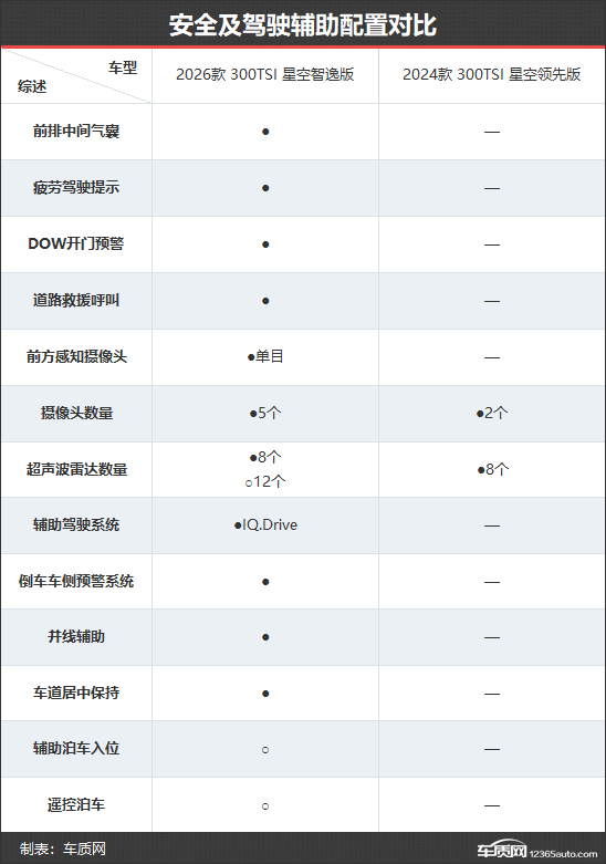 安全配置方面,新款车型在老款车型的基础上进一步完善,增加了前排中间气囊、DOW开门预警、道路救援呼叫等配置。此外,与老款车型相比,新款车型的驾驶辅助配置大幅升级,增加了1个单目前方感知摄像头,摄像头数量也提升至5个,并采用了IQ.Drive辅助驾驶系统,使其具备并线辅助、车道居中保持等功能,更符合当下消费者的用车需求。